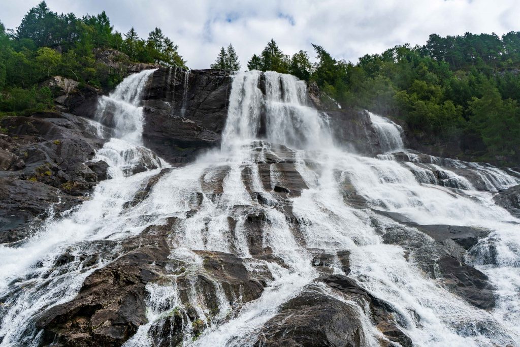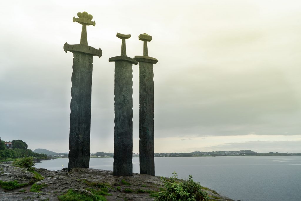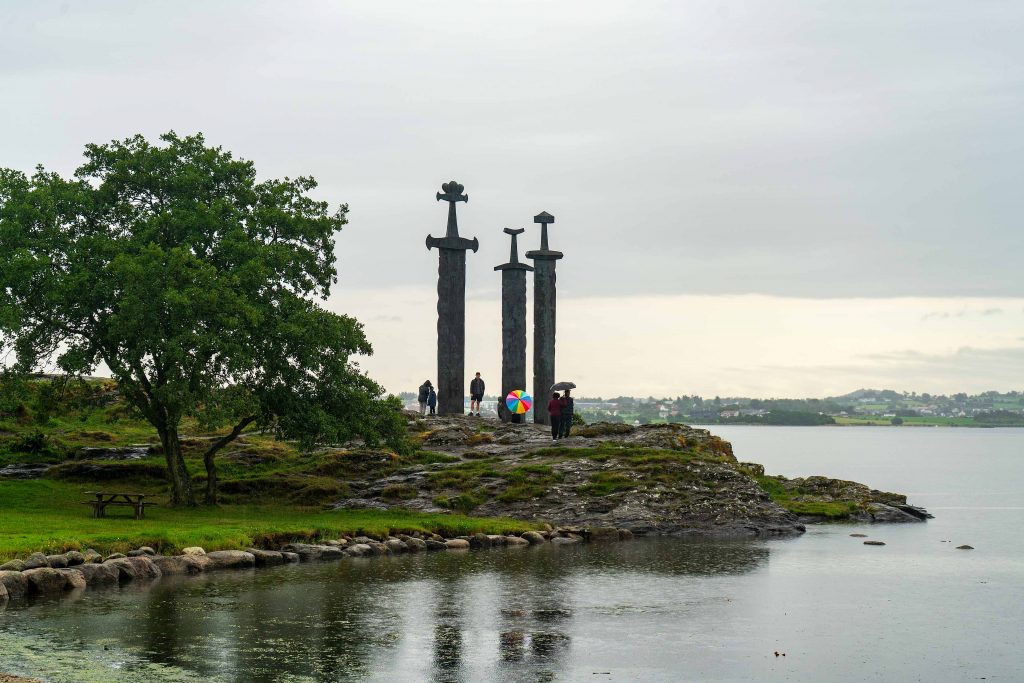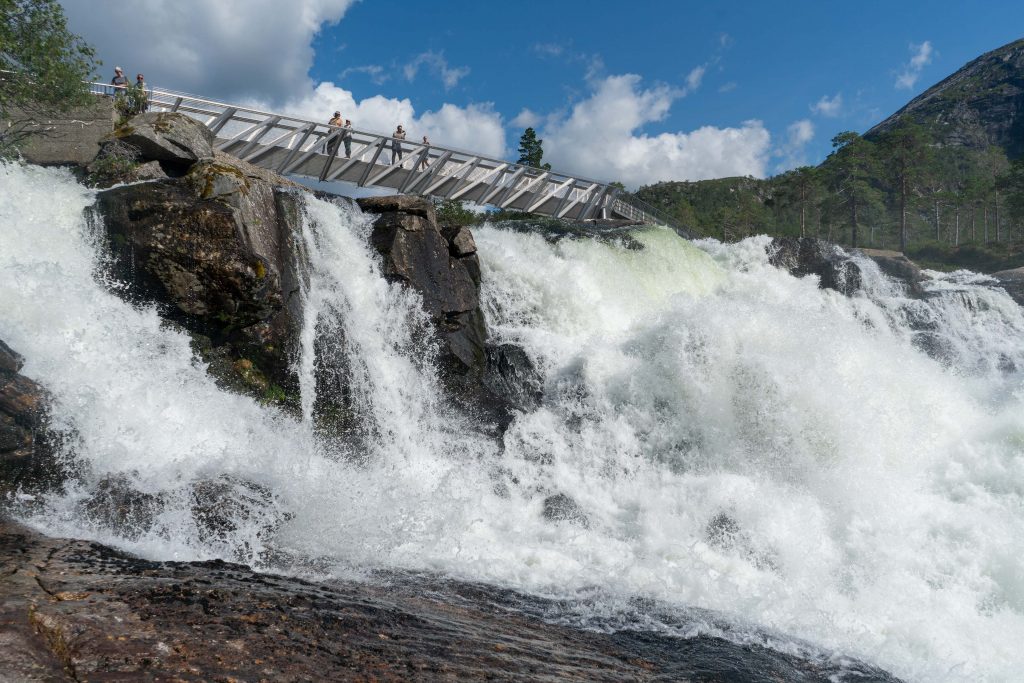 An einem verregneten Tag führt uns unser Weg nach Tyssedal. Bevor wir aber Stavanger verlassen, besichtigen wir noch die 3 Schwerter im Fels. Harald Schönhaar soll hier im Jahr 872 Norwegen zu einem Königreich geeint haben. Das Denkmal besteht aus drei Schwertern, die im Fels stecken, es steht für Frieden, Einheit und Freiheit. Die Griffe der Wikingerschwerter sind Schwertfunden aus verschiedenen Teilen Norwegens nachempfunden. Das Denkmal wurde von Fritz Røed (1928-2002) gestaltet und im Jahr 1983 von König Olav eingeweiht. Kurz vor Odda passieren wir den Wasserfall Langfoss. Mit einer Fallhöhe von 612 Metern gehört er zu den höchsten Wasserfällen der Erde.