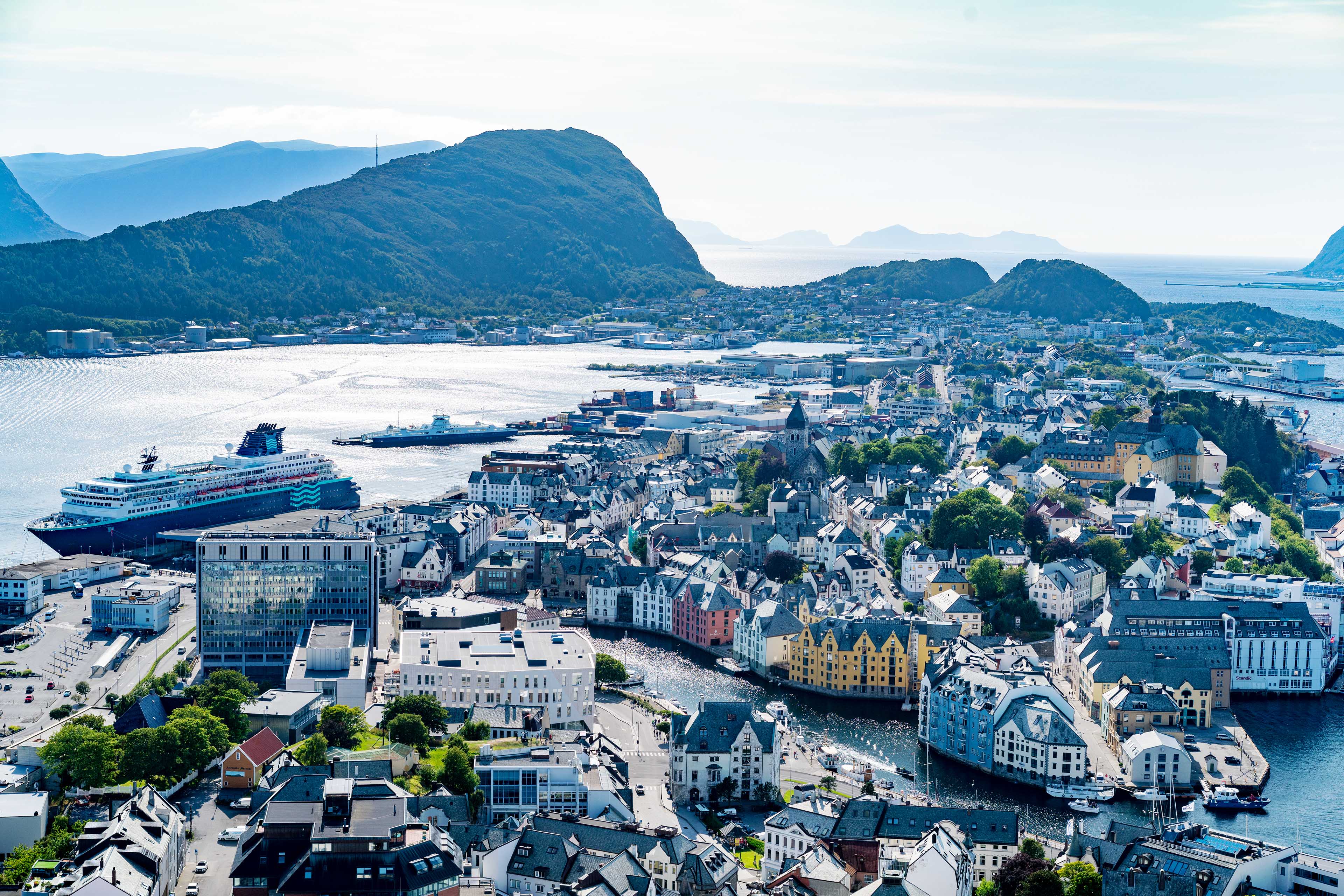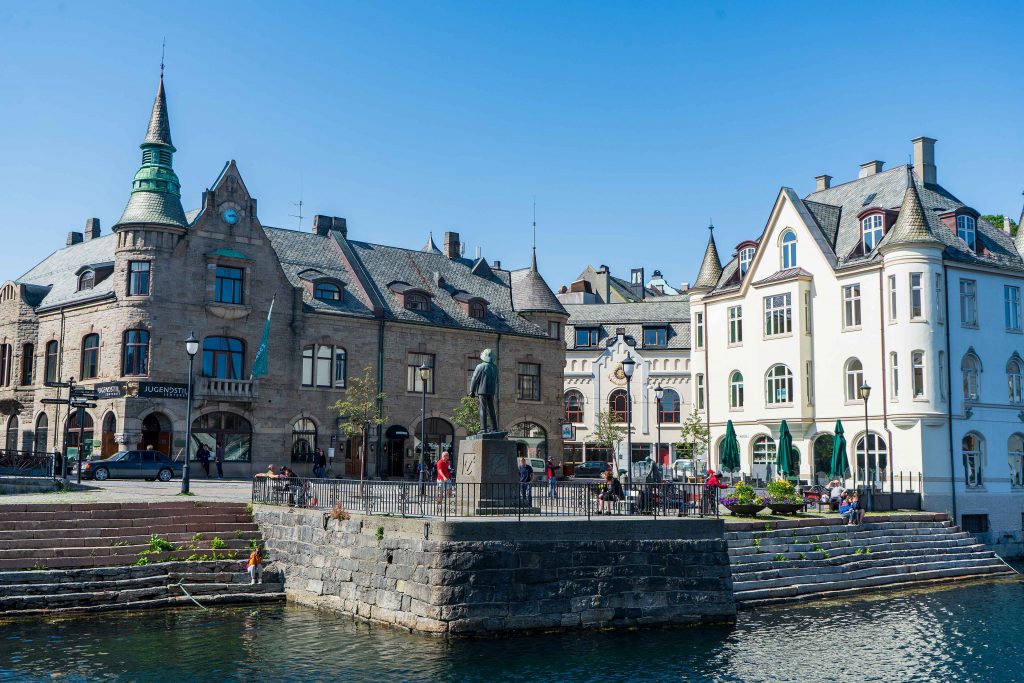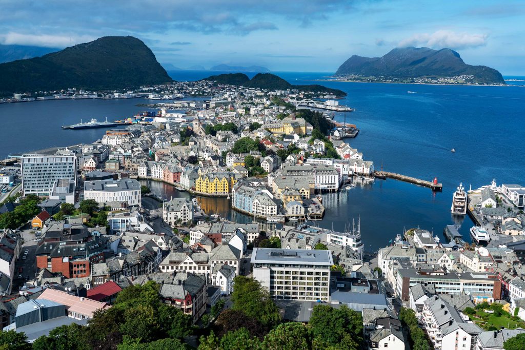Das Wetter verwöhnt uns und wieder bricht ein Sommertag an. So haben wir eine wunderbare Fahrt nach Ålesund, die als schönste Stadt Norwegens gilt. In der Stadt herrscht eine angenehme Atmosphäre, es geht ruhig zu, vielleicht weil Sonntag ist. Die große Anzahl an Jugendstilgebäuden ist ironischerweise einem Feuer zu verdanken, das im Jahre 1904 fast die komplette Innenstadt zerstörte. Beim Spaziergang durch die Innenstadt kann man die fantasievollen Ornamente an den Häuserfassaden bewundern. Natürlich gehe ich auch die 418 Stufen lange Treppe zum Gipfel des Berges Aksla hinauf und werde mit einer unvergleichlichen Aussicht über die Stadt belohnt.