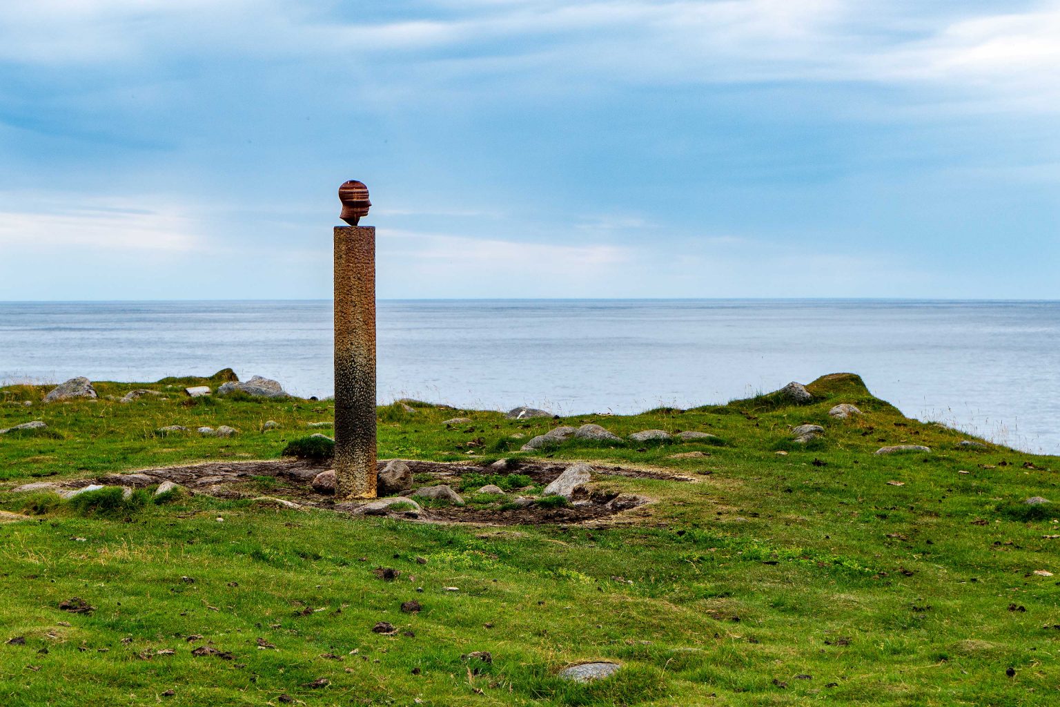 Da das Wetter nur mittelmäßig ist, entschließen wir uns zu einem Alternativprogramm. Kunst soll es heute sein, nicht in einem Museum, sondern in der freien Natur. Bei Eggum befindet sich ein äußerst interessantes und faszinierendes Kunstwerk. Markus Raetz’ Skulptur «Kopf» befindet sich an einem Ort, an dem man keine Skulptur erwartet. Die Skulptur des Schweizer Künstlers besteht aus einem schönen, klassischen Kopf, der auf einer Steinsäule ruht, die genauso kerzengerade und straff erscheint wie der Horizont. Der Kopf ist unbeweglich, dennoch steht er trotzdem plötzlich auf dem Kopf, man muss sich nur um die Skulptur herum bewegen. Insgesamt 16 verschiedene Ansichten soll es geben. Wir sehen nur vier, sind aber beeindruckt von dieser Arbeit. Das ist wahrlich Kunst.