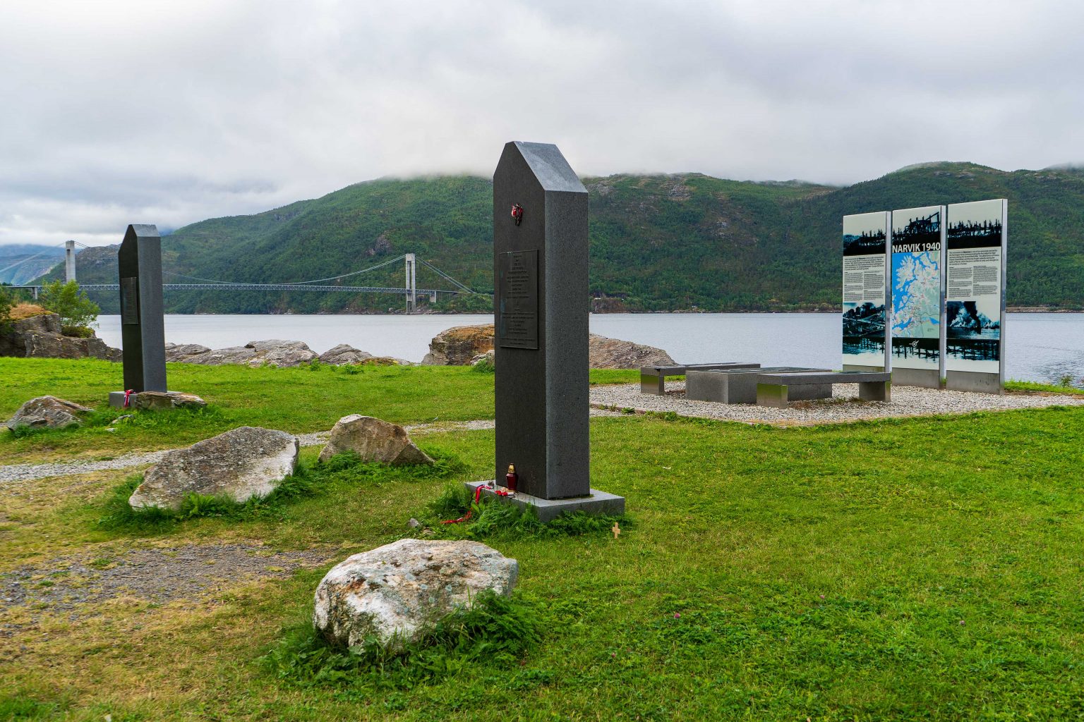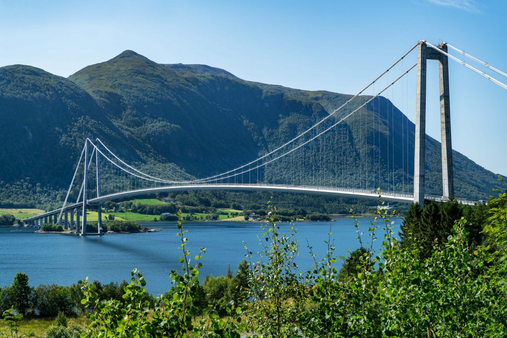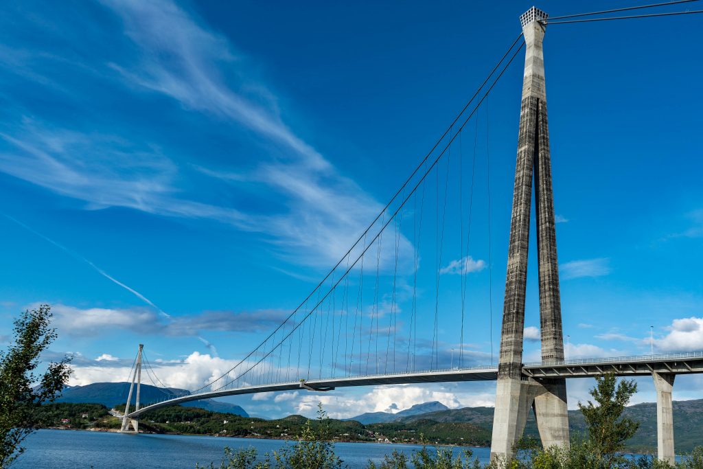 Wie vom Wetterbericht vorhergesagt ist heute ein wunderbar sonniger Tag. Bevor wir nach Narvik fahren machen wir daher natürlich noch einmal eine Rundfahrt durch Senja. Bei Hamn schimmert das Wasser in der Inselwelt herrlich türkisfarben. Die Gipfel der Berge sind mit wenigen Ausnahmen wolkenfrei und zeigen ein grandioses Panorama. Wir machen tolle Aufnahmen und brechen am Nachmittag Richtung Narvik auf. Kurz vor Narvik kommen wir heuer in den Genuss über die hochmoderne Hålogalandbrücke fahren zu können. Sie wurde nach 5-jähriger Bauzeit im Dezember 2018 eröffnet und ist die längste Hängebrücke Norwegens. Das chinesisch – norwegische Projekt erspart dem Verkehr eine Fahrt von 17 Kilometern um den Fjord herum.