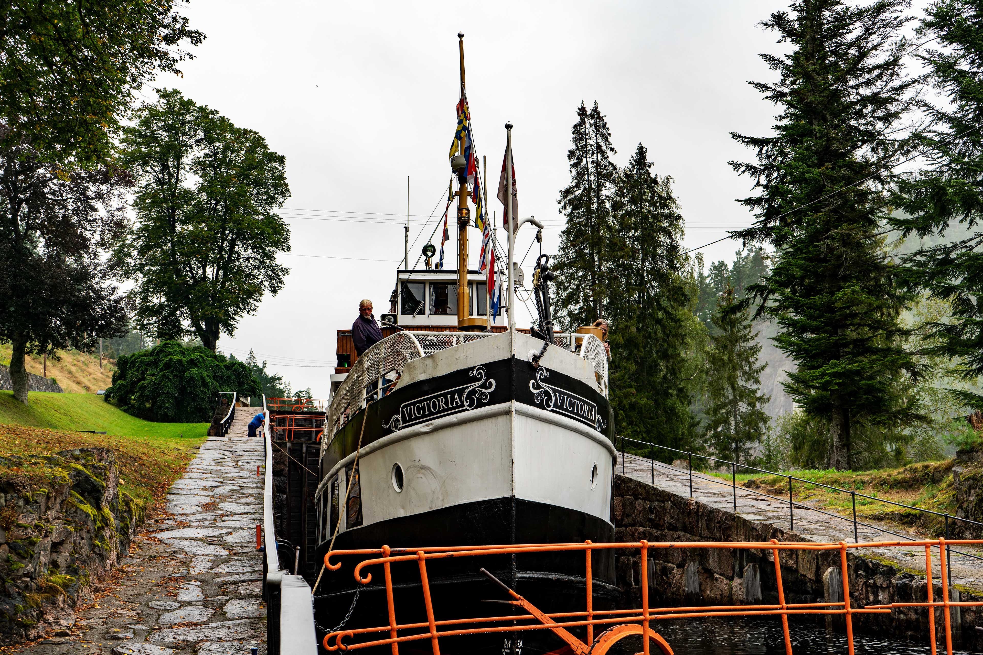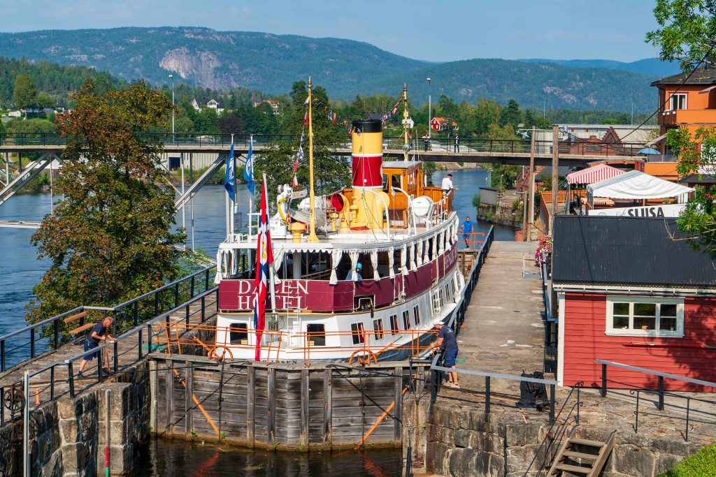 Der Vormittag ist verregnet, aber gegen Mittag hört es auf und wir fahren noch einmal zur Vrangfoss Schleuse. Dort soll heute die M/S Victoria, die Königin des Telemarkkanals von Dahlen kommen. Das Passagierschiff wurde 1882 gebaut und verkehrt seitdem mehr oder weniger regelmäßig auf der Strecke Skien – Dahlen, heutzutage meist in den Sommermonaten.