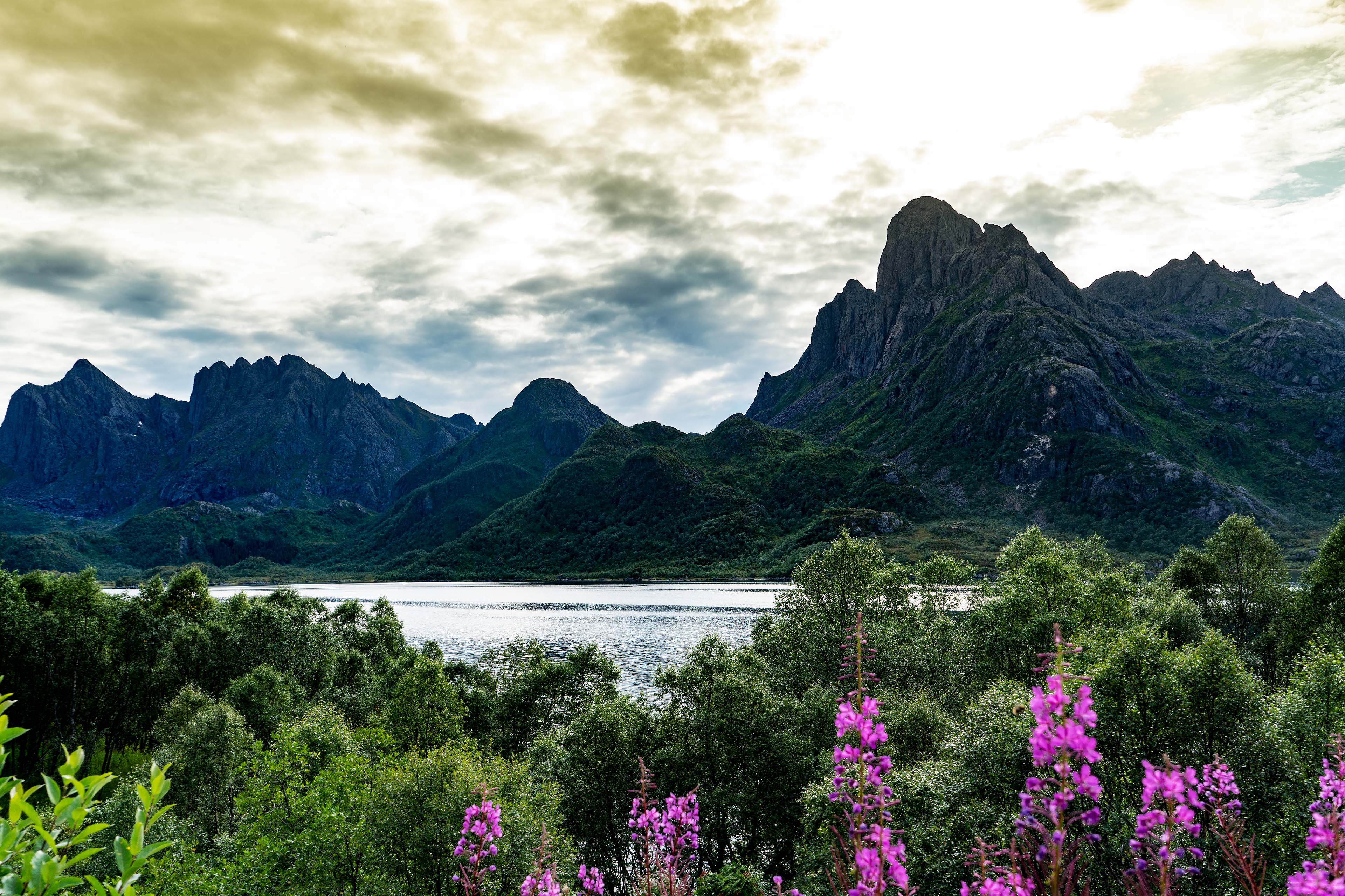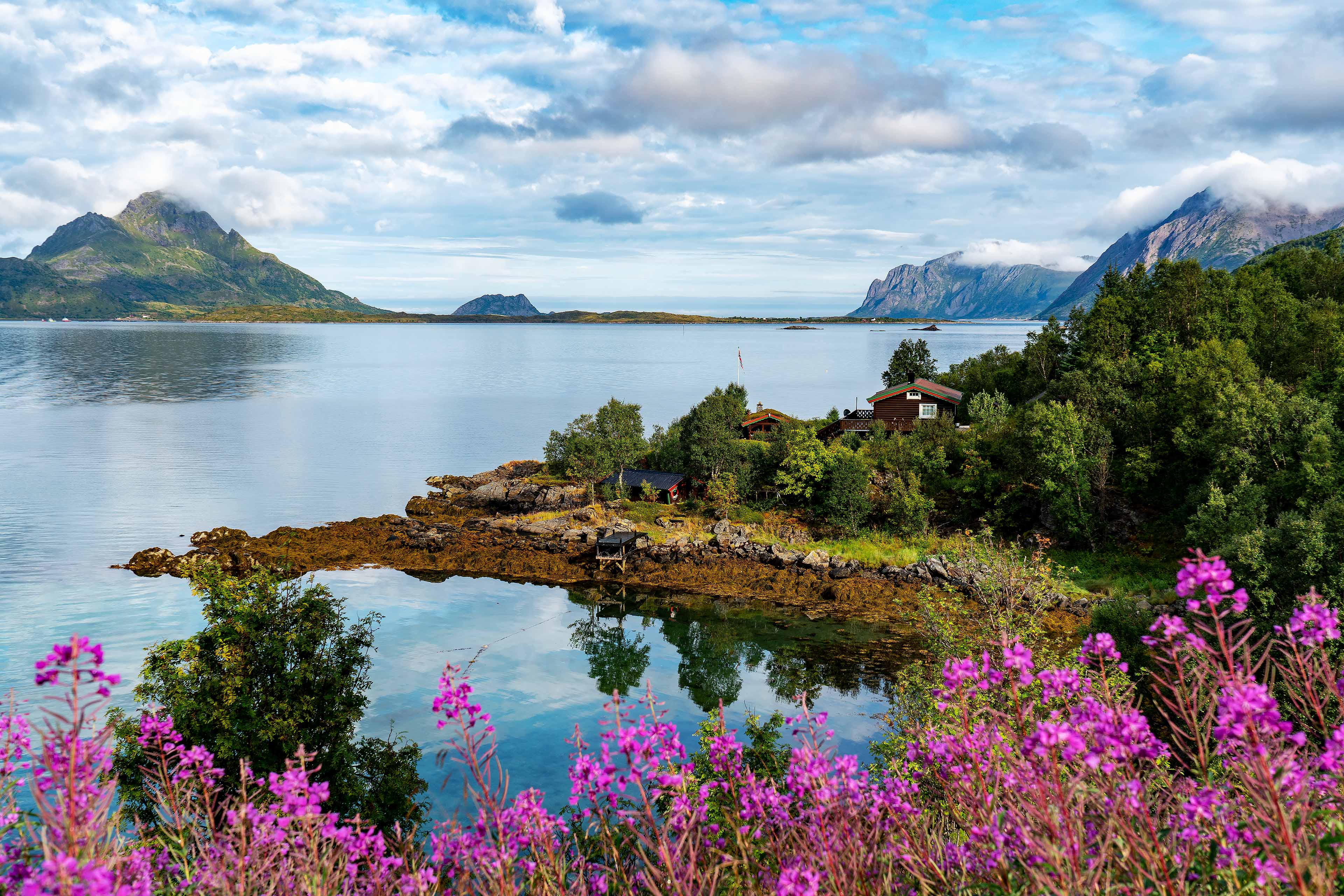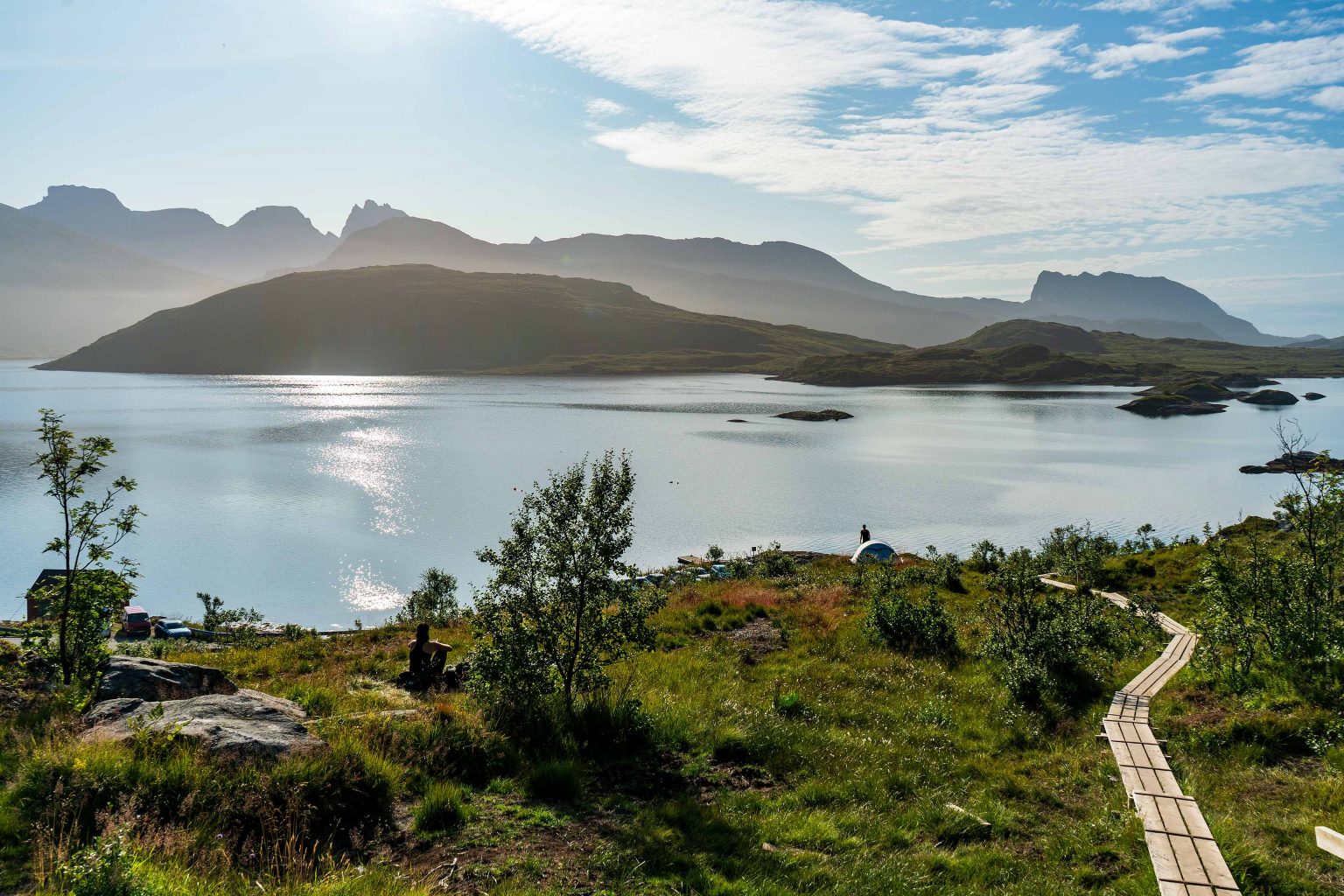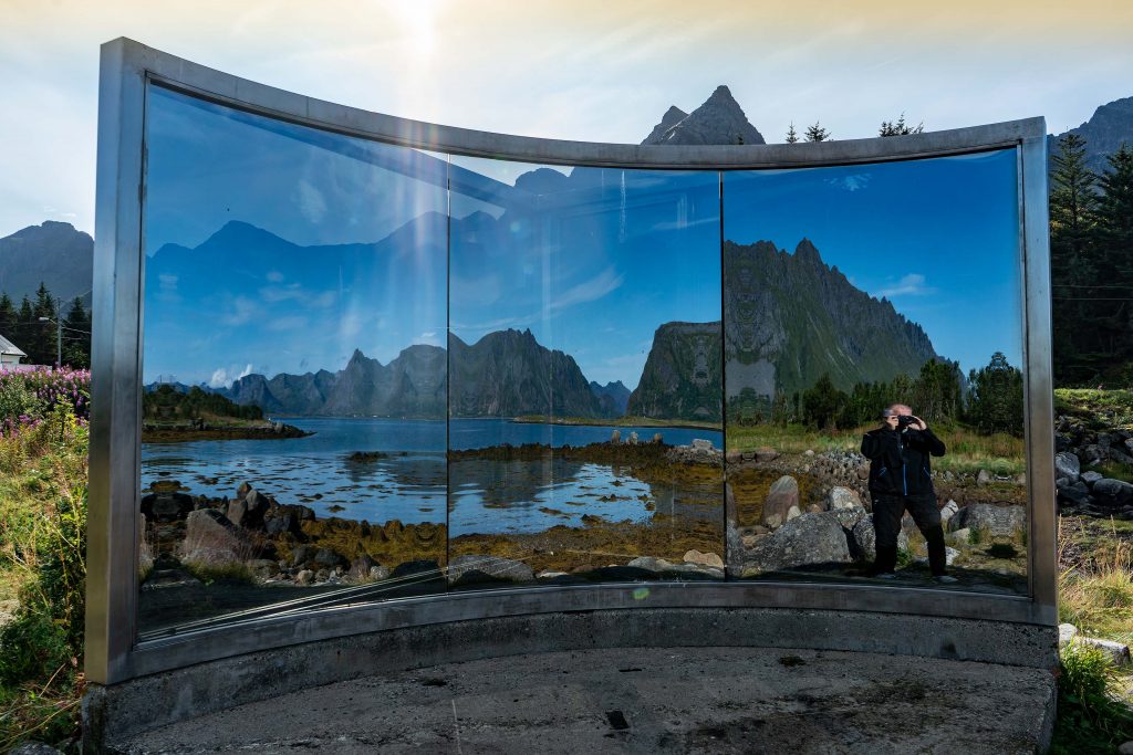 Nach einer Woche auf den Lofoten brechen wir zu den Inseln der Vesterålen auf. Auf der Fahrt besichtigen wir noch einmal Kunst in der Landschaft. Bei Vågan steht der Spiegel des amerikanischen Künstler Dan Graham, in dem sich die umliegende Landschaft spiegelt. Je nach Position kann man sich ins Bild bringen, oder auch nicht. Ein kurzer Stopp in Henningsvaer und am Austnesfjorden und es geht weiter. Unser erstes Ziel auf den Vesterålen ist die Insel Langøya und das Fjordcamp in Krågberget. Langøya ist die drittgrößte Insel Norwegens und bietet wie die anderen Inseln der Vesteralen unterschiedliche Landschaftsformen. Es gibt mächtige Berge, schroffe Felsenwände, karge Heide- und waldbedeckte Hügellandschaft, und natürlich Küste mit schönen Stränden. Die Fahrt verläuft reibungslos und das Radrennen, das heute mit der 3. Etappe auf der Insel Station macht, behindert uns nur kurz. Am Abend erreichen wir, durch herrliche Berglandschaft fahrend, unser Tagesziel.