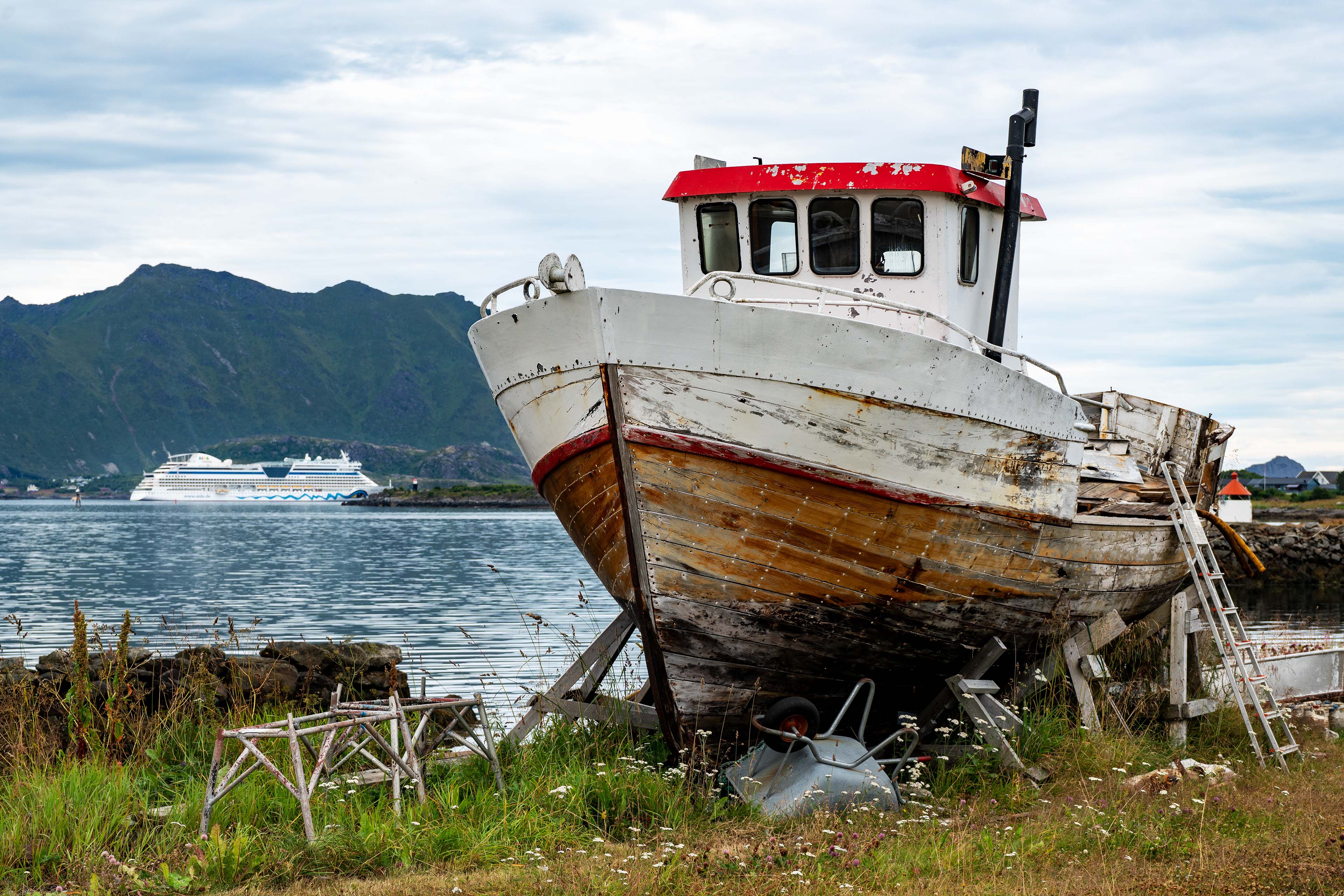 Bei herrlichem Sonnenschein machen wir uns auf die Fahrt zu den Lofoten. Wir nehmen wieder die Fähre von Bognes nach Lødingen. Sie ist modern und braucht nur eine Stunde um die Fahrt um einige Stunden zu verkürzen. Auch wenn man schon mal da war, die Landschaft beeindruckt immer wieder und es ergeben sich auch neue Blicke. Dieses Mal übernachten wir in Ballstad, was wir im letzten Jahr gar nicht besucht haben. Der Ort liegt wunderschön am Meer und den Bergen. Nach einem schönen Abend regnet es nach knapp zwei Wochen wieder einmal.