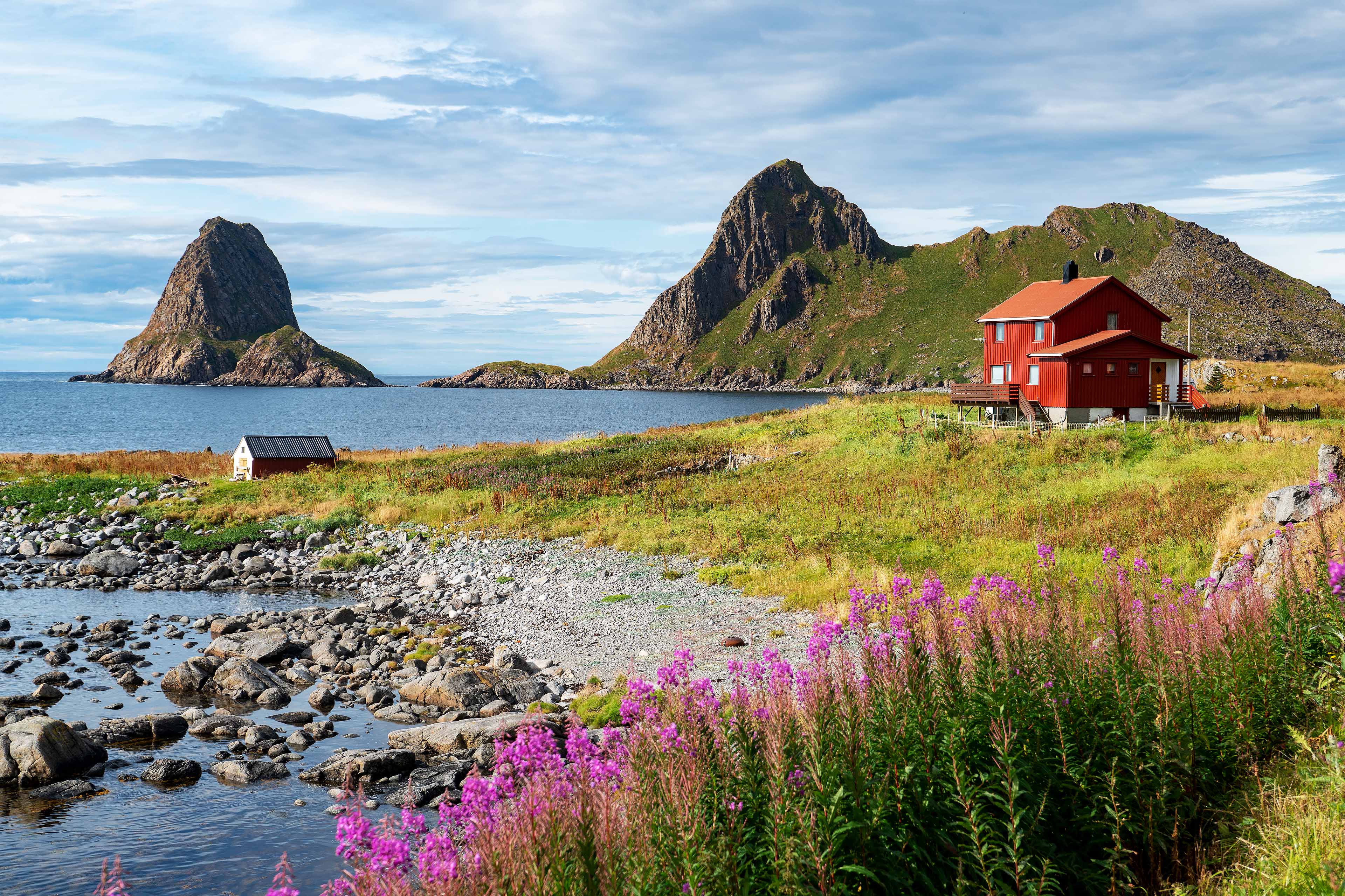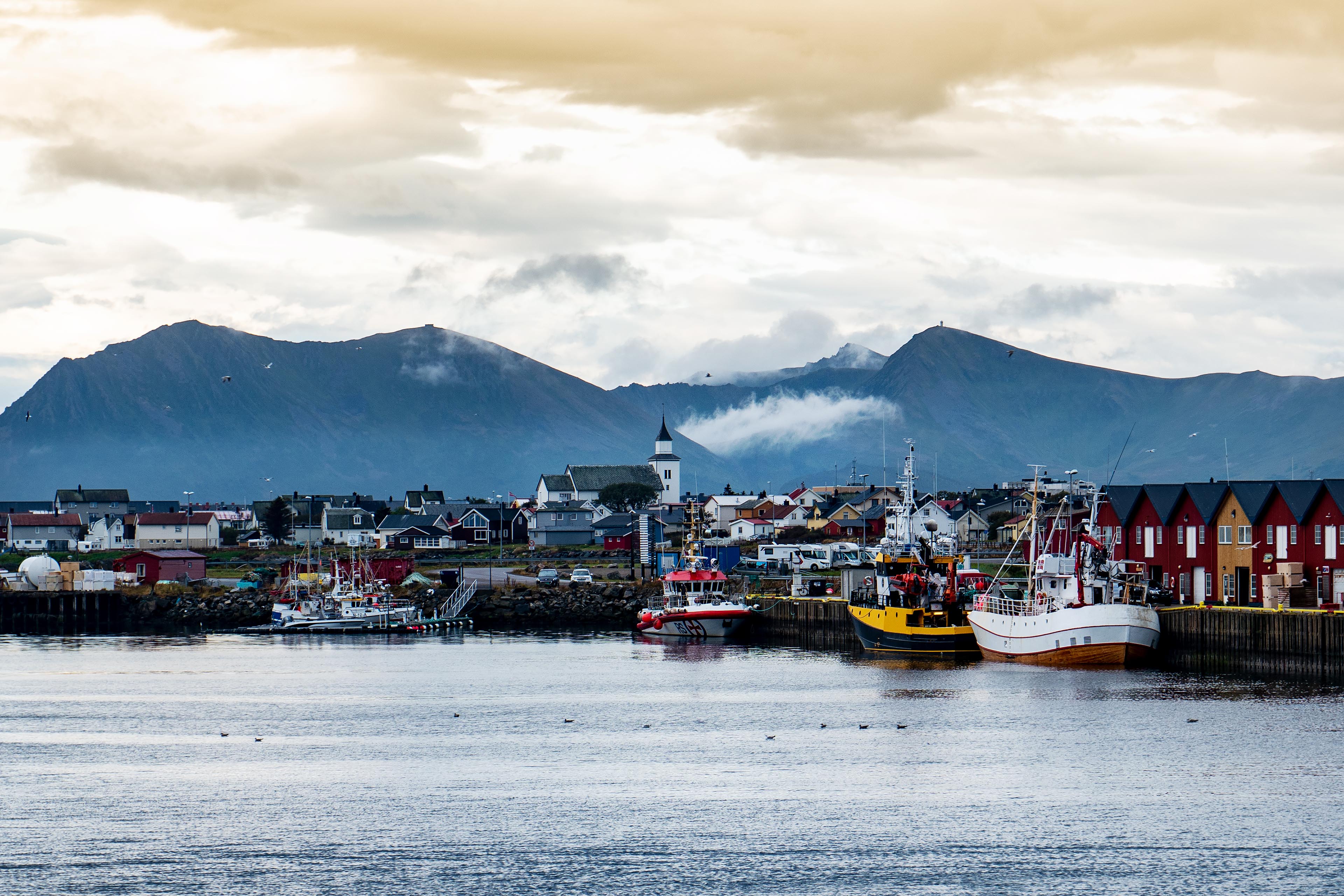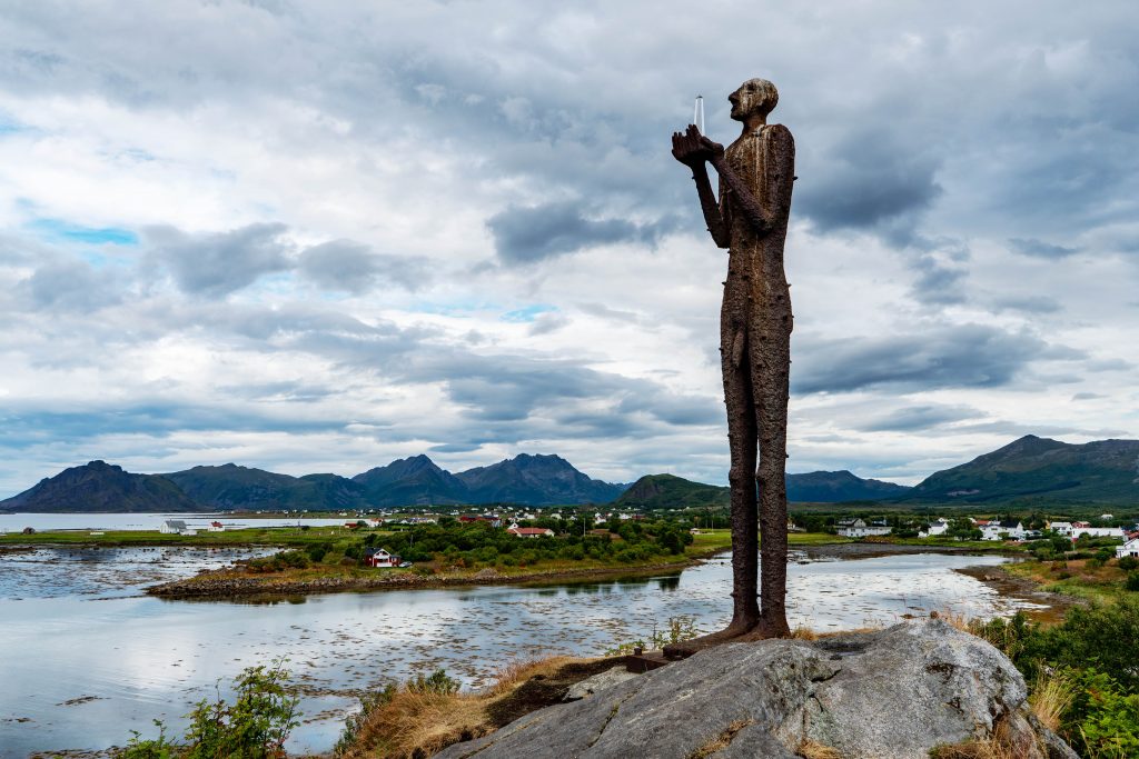 Auf unserem Teil der Insel von Langøya sind die Fahrtstrecken nicht besonders lang und man kommt rasch zu den interessanten Zielen. Unser erstes Ziel ist bei Vinjesjøen der „Mannen fra havet“, der Mann vom Meer. Kjell Erik Killi Olsen, der norwegische Künstler, der diese Skulptur 1994 erschaffen hat, spinnt den Mythos von einem Mann, der das Meer verlassen hat und jetzt auf festem Grund steht. In der Hand hält er einen obeliskförmigen Kristall, wie eine Opfergabe an seinen früheren Wohnort. Der Standort der Skulptur in der Nähe des Fjords unterstreicht die Huldigung des Mannes an das Meer. Nach der Besichtigung beschließen wir im Norden an die Küste zu den kleinen Fischerdörfern, Nykvåg und Hovden zu fahren. Die schmale Küstenstraße bietet immer wieder Ausblicke auf fantastische Landschaft und wir erreichen die doch recht abseits gelegenen Dörfer. Hovden, eine malerische Siedlung mit weitgehend historischer Bebauung, umgeben von großen Trockenfischgestellen, liegt nicht nur am Ende der Straße, sondern gefühlt irgendwie auch am Ende der Welt.