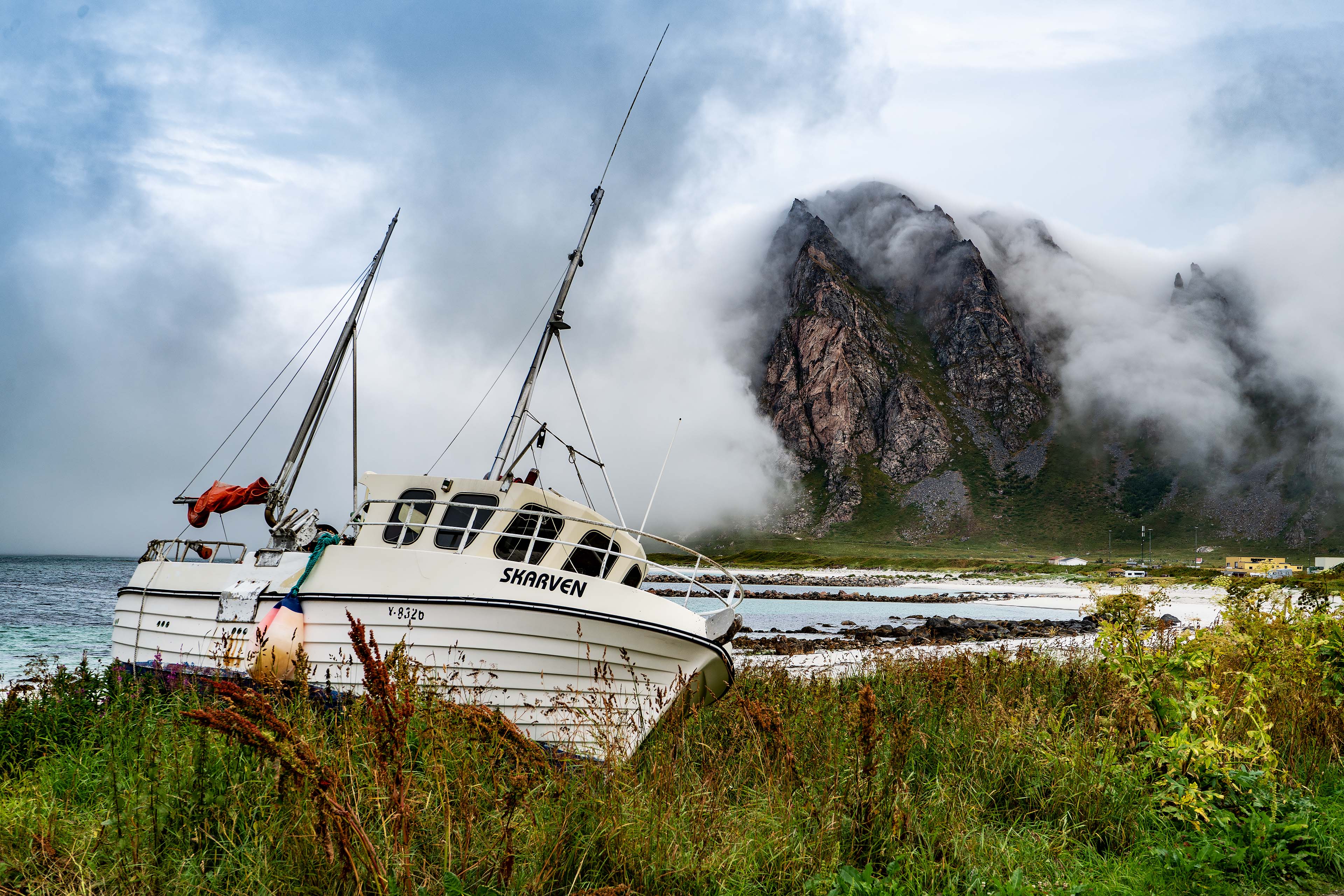 Die Lofoten ohne Berge? Ja, das gibt es auch. Ein Regengebiet hüllt heute alle Berge in weiße Wolken. Es regnet nicht den ganzen Tag, aber immer wieder und wir verbringen den Vormittag in unserer schönen Wohnung der Hemmingodden Lodge. Am Nachmittag erspähen wir über Nusfjord etwas besseres Wetter und wir beschließen einen kurzen Ausflug dorthin zu machen. Es bleibt trocken und es kann die Drohne sogar ein paar Runden fliegen.