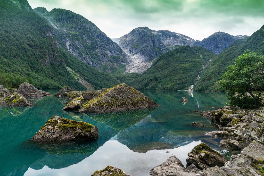 Am Morgen entschließen wir uns bei gutem Wetter in den Folgefonna Nationalpark zu fahren. Herzstück des Parks sind die Gletscher. Der Plateaugletscher “Folgefonna” besteht aus drei Gletscherteilen: Nordfonna, Midtfonna und Sørfonna, sowie zahlreichen weiteren kleinen Gletscherinseln darum herum. Mit dem Auto kommt man am leichtesten zum Gletscher, wenn man ins Sommerskigebiet fährt. Auf enger, kurviger Straße fährt man bis auf etwa 1200 Meter Höhe. Während der Fahrt und ganz oben bieten sich immer wieder tolle Ausblicke. Ski wird derzeit dort nicht gefahren, aber man kann geführte Gletschertouren unternehmen. Am Nachmittag machen wir eine leichte Wanderung zum Bondhusvatnet See, der idyllisch unterhalb des Bondhus Gletschers gelegen ist. Leider hat sich der Gletscher weit zum Gipfel zurück gezogen und es ist von ihm nur wenig zu sehen. Früher reichte er bis zum See.
