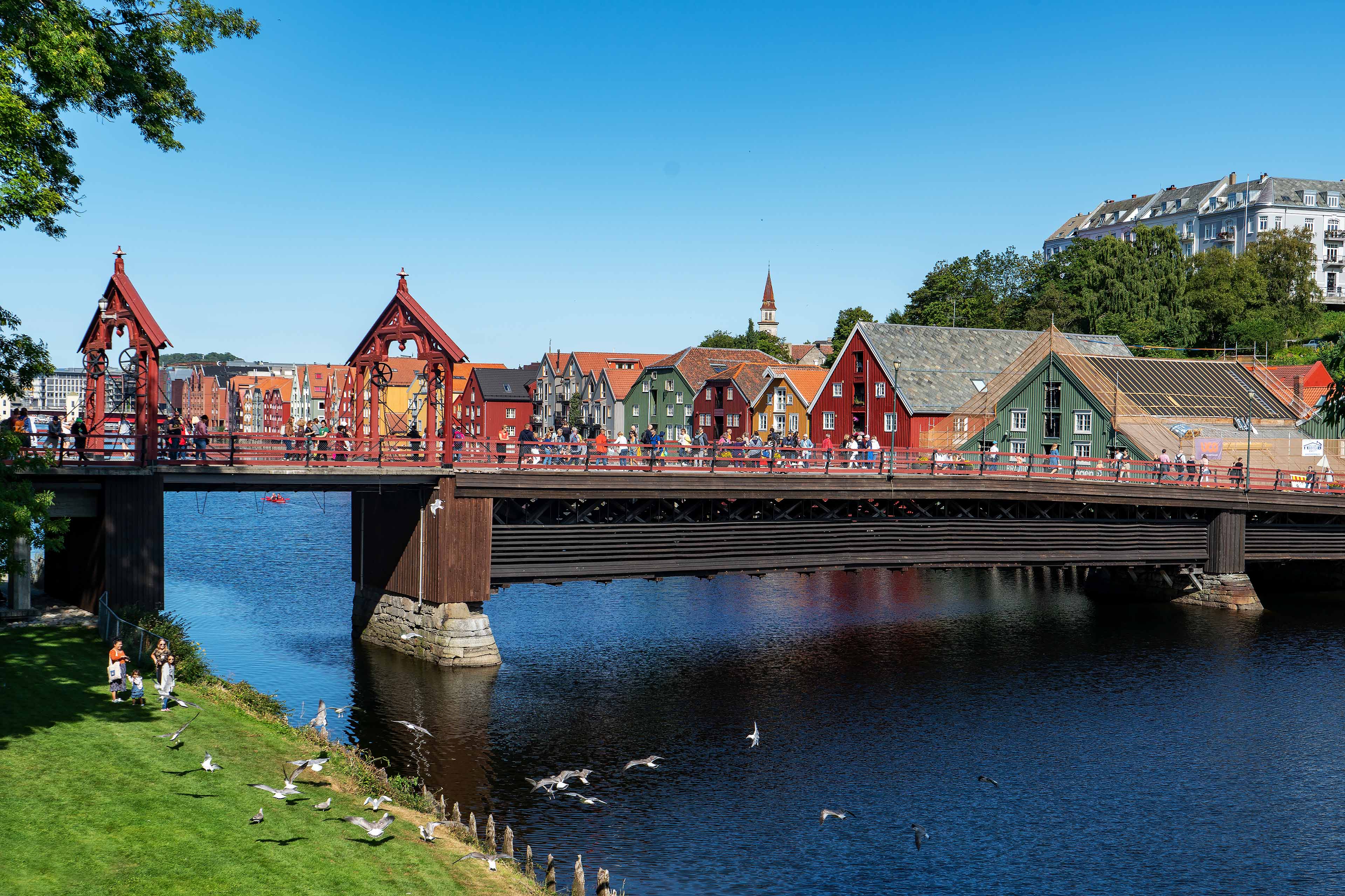Wir waren zwar schon letztes Jahr in Trondheim, aber die Stadt ist immer einen Besuch wert. Heute besichtigen wir die Festung Kristiansten. Die Festung wurde nach dem großen Stadtbrand Trondheims errichtet, um Angriffe aus Richtung Osten abwehren zu können. Die Fertigstellung erfolgte 1684. Der auffälligste Bestandteil der Festung ist der weiße Donjon, ein vierstöckiger Turm mit Schießscharten. Von hier oben haben wir einen guten Blick über die Stadt. Berühmt ist Trondheim aber wegen seines Doms. Der Nidarosdom steht mitten in der Stadt. Er wurde ab 1070 erbaut und ist das wichtigste gotische Baudenkmal in Norwegen. Im Mittelalter und nach Norwegens wiedererlangter Eigenständigkeit ab 1814 war der Nidarosdom die Krönungskirche der norwegischen Könige. Auch der heutige König Harald V. mit Königin Sonja wurde 1991 hier gekrönt. Das Viertel der Speicherhäuser am Fluss Nidelva kennen wir zwar, aber man findet immer wieder neue Schmuckstücke, die als Café oder Restaurant genutzt werden.