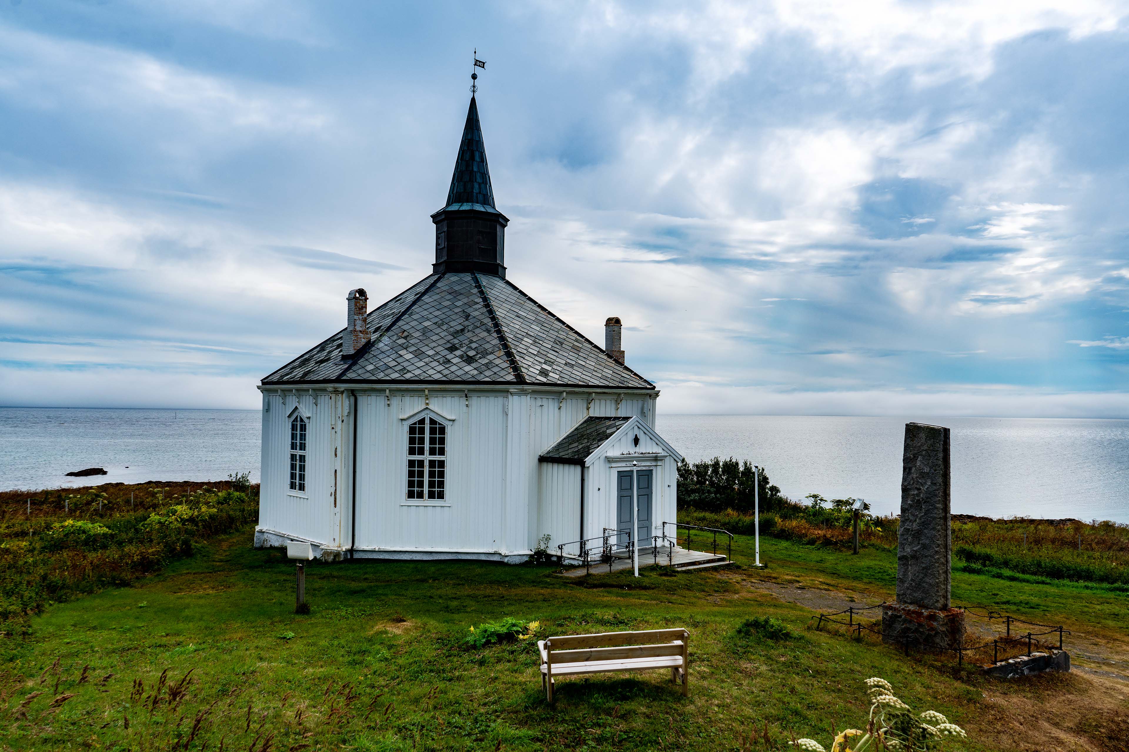 Wir verlassen Langøya, vorbei an am Fjord idyllisch gelegenen Orten, um auf Andøya, der nördlichsten Insel der Vestervålen nach Andenes zu gelangen. Es sind heute nur 120 Kilometer zu bewältigen. Auf Andøya ändert sich das Landschaftsbild. Im Osten flaches Land, Äcker, Wiesen und Moore. Nur der Westen ist bergig. In Dverberg machen wir an der alten Kirche halt. Sie ist eine Pfarrkirche der Church of Norway. In ihrer heutigen Form wurde sie 1843 fertiggestellt und 1930 einer umfangreichen Restauration unterzogen. Je weiter nördlich wir kommen, desto schlechter wird das Wetter, bis Andenes komplett im Nebel versinkt. Nebelschwaden ziehen vom Meer herein und wir fahren, bis wir ins Hotel können nach Bleik. Dort schimmert ab und zu die Sonne durch den Nebel und das Bergpanorama bietet interessante Ansichten.