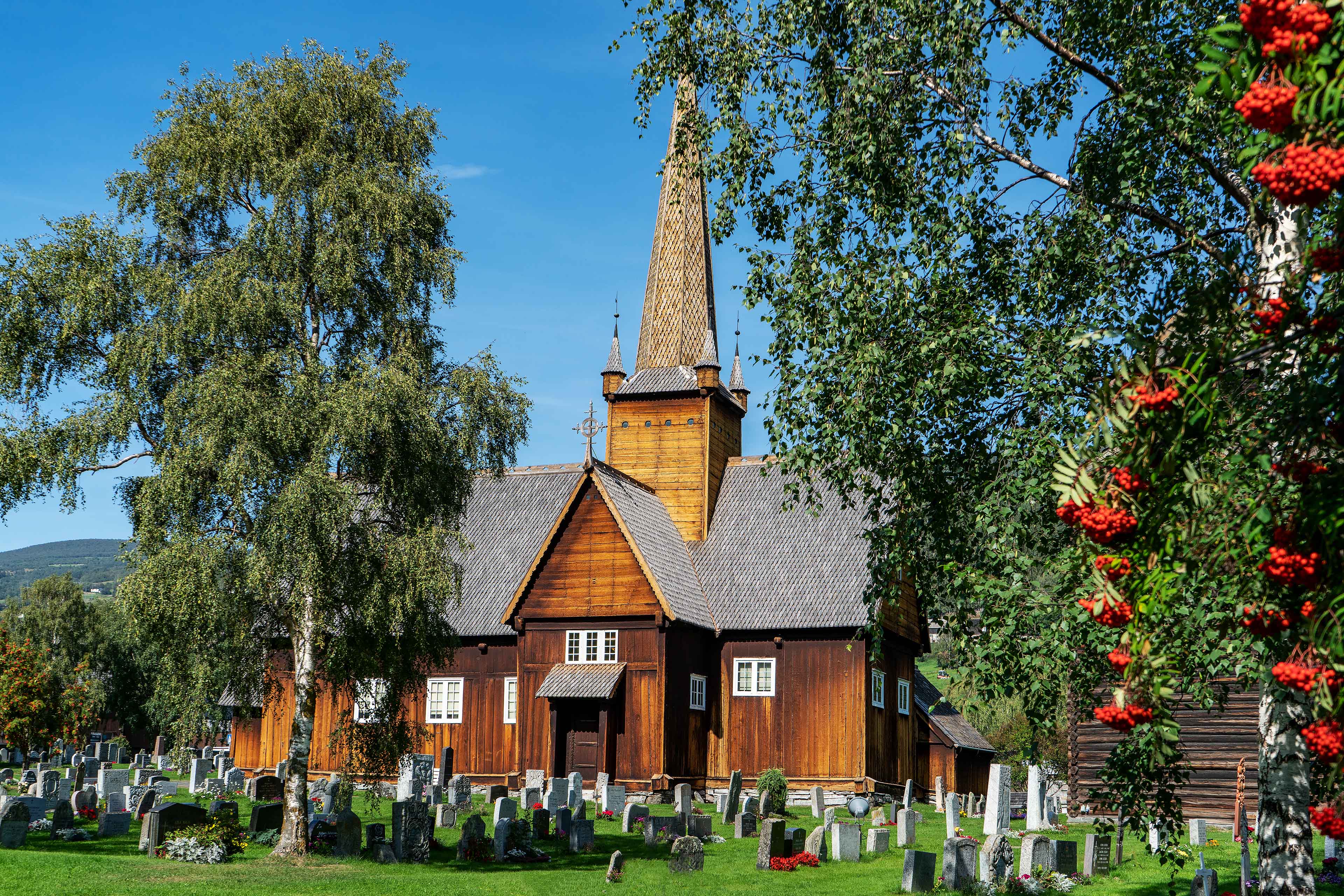 Bei strahlendem Sonnenschein verlassen wir Trondheim. Heute ist wieder Sommerkleidung angesagt, es soll über 20 Grad geben. Unser Ziel ist der Jotunheimen Nationalpark mit seinen hohen Bergen und Gletschern. Im Reich der Riesen, so Jotunheimen übersetzt, befinden sich die höchsten Gipfel Norwegens. Unser erstes Ziel ist die Gemeinde Vågå, mit ihrer schönen Kirche aus dem 17. Jahrhundert. Von hier aus führt die County Road 51 über das Plateau der Valdresfrya und erreicht 1.389 Meter über dem mittleren Meeresspiegel. Die Strasse, die nur von Mai bis Ende September befahrbar ist, führt durch wilde, unberührte und weitläufige Gegenden. Nun ja, auch einige Dörfer und Campingplätze befinden sich hier, denn die Gegend ist ein Paradies für Wanderer. Gleich auf den ersten Kilometern befindet sich am See Lemonsjøen ein weiterer Spiegel des Künstlers Dan Graham. Die Skulptur Norwegian Wood Lattice Bisected By Curved 2-way-mirror ist das erste Werk, das im Rahmen des Projekts Skulpturstopp im Jahr 2010 enthüllt wurde. Das aus Glas und Holz bestehende Kunstwerk spiegelt die es umgebende Natur wider. Der Betrachter kann es umrunden und bekommt durch die eigene Bewegung vermittelte Eindrücke. Faszinierend! Und weiter geht unsere Fahrt vorbei an Seen und Bergen über die Hochebene bis wir unser Ziel, den Wintersportort Breitostølen erreichen.