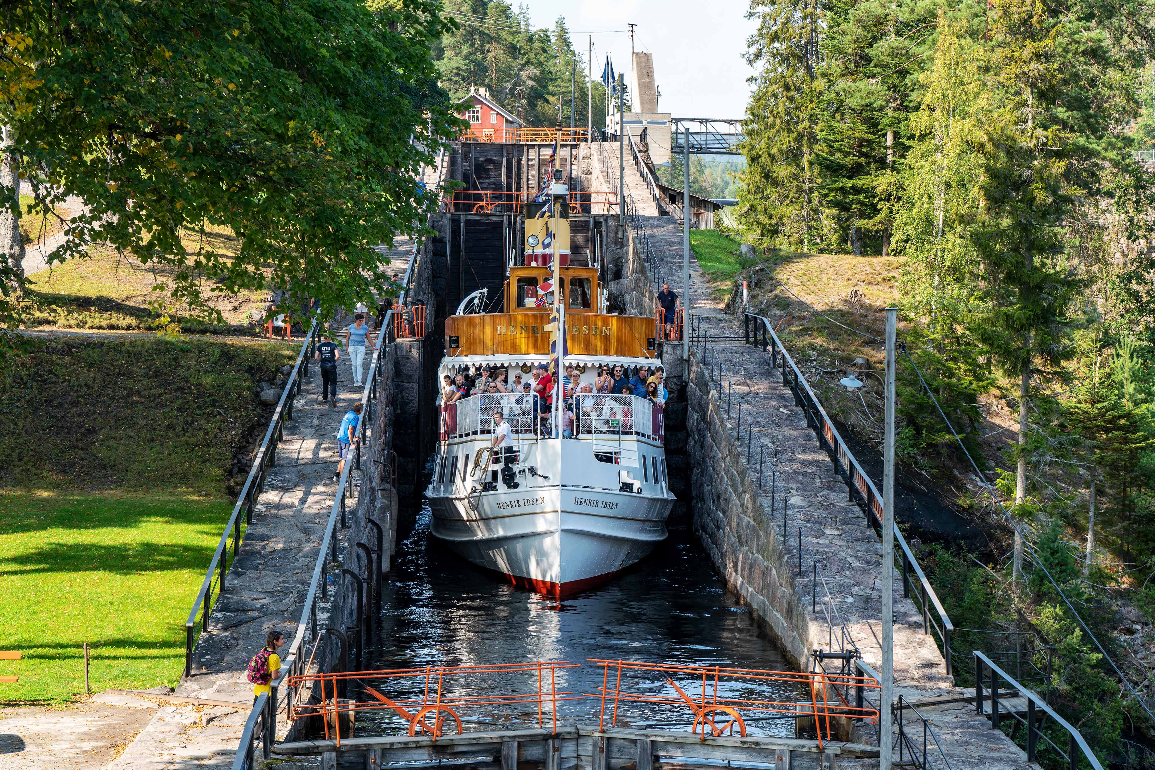 Heute geht es weiter in den Süden Norwegens. Unser Ziel ist der Telemarkkanal. Er ist 105 Kilometer lang und verbindet die Orte Skien und Dalen. Charakteristisch für den Telemarkkanal sind seine historischen, originalgetreu erhaltenen und handbetriebenen Schleusen, von denen die Vrangfoss Schleuse die beeindruckendste ist. Noch heute verkehren die Linienschiffe M/S Victoria, die M/S Henrik Ibsen und die M/S Telemarken auf der Route. Wir haben gut geplant und erreichen nach längerer Fahrt rechtzeitig die Schleuse um eine Schiffsdurchfahrt zu sehen, was nur einmal am Tag möglich ist. Nachdem wir noch zwei weitere Schleusen besichtigt haben erreichen wir Skien.