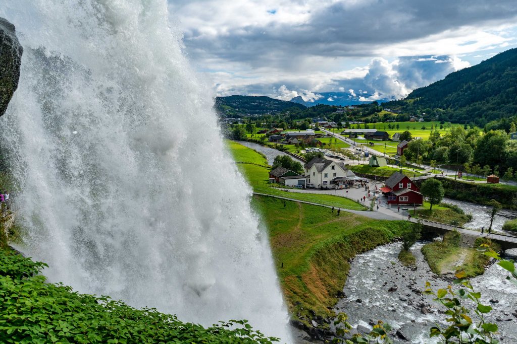 Unser zweitägiger Aufenthalt in der Gegend Hardanger beginnt mit der Fahrt über die Staatsstraße 7 zum Hardangerfjorden. Vorbei an vielen Wasserfällen gelangen wir zum herrlichen Steinsdalsfossen, der zwar nicht der Wasserfall mit der höchsten Fallhöhe ist, aber zu den außergewöhnlichsten Wasserfällen in Norwegen zählt. Hier können wir hinter dem Wasserfall entlanggehen, ohne nass zu werden! Entlang des Fjordufers führt die Straße mal breiter, mal schmaler voran, und wir besuchen den Skjervsfossen. Das Erlebnis eines Wasserfalls variiert je nach Jahreszeit, Wassermasse und vor allen Dingen Wetter. Da es wieder einen kurzen Regenschauer gibt, hält sich unsere Begeisterung in Grenzen und wir bleiben nicht lange. Bewundern dürfen wir aber wieder die Baukunst der Norweger. Die Hardangerbrücke ist gewaltig und verbindet, direkt an zwei Tunnel angeschlossen, beide Ufer. In den Tunnel kann man über Kreisverkehre in verschiedene Richtungen abbiegen, faszinierend!