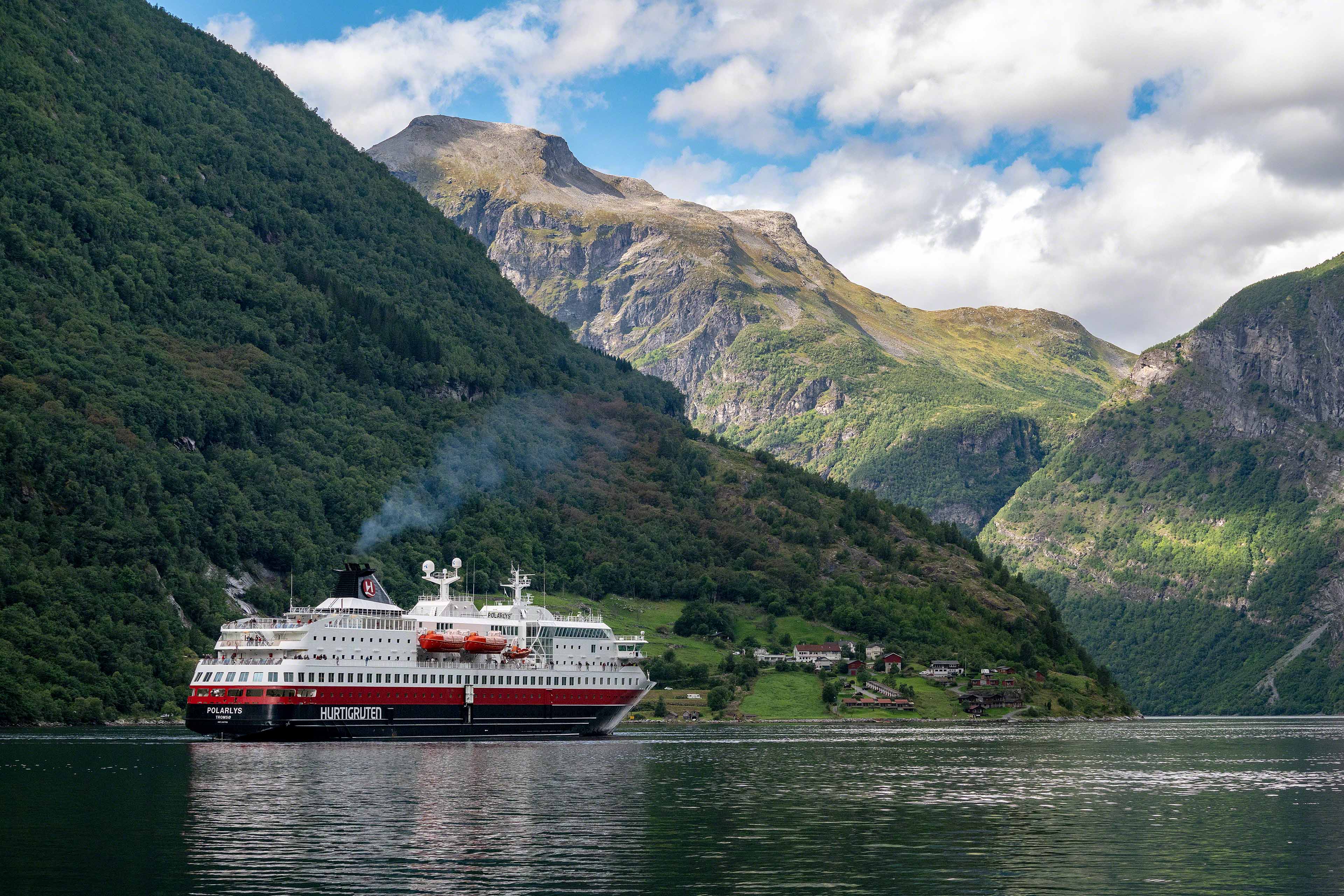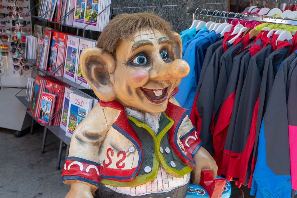 Wir sind in Geiranger, einer der Touristenhochburgen Norwegens. Auch zu dieser Jahreszeit ist noch enorm viel los. Es wimmelt von reiselustigen Japanern und Besuchern aus aller Herren Länder, und die Serpentinen der Passstraßen sind voll von Reisebussen und Wohnmobilen. Dennoch findet man auf den, teilweise wenigen Parkplätzen der Aussichtspunkte, schnell eine Lücke. Bei ordentlichem Wetter genießen wir einen imposanten Blick vom Flydalsjuvet, den wir als Erstes ansteuern, auf den tief unten im Tal liegenden Ort und den Fjord. Auf der anderen Talseite schraubt sich die Straße, genannt Ørnevegen, die Adlerstraße, auf elf Serpentinen von Meereshöhe hinauf auf 624 Meter zum Aussichtspunkt Ørnesvingen. Von hier kann man in den Fjord bis zum Wasserfall „die sieben Schwestern“ sehen. Leider schreibt kein Reiseführer, dass dieser, aus sieben kleinen Fällen bestehende Wasserfall, nur nach der Schneeschmelze im Frühjahr in ganzer Pracht zu sehen ist. Wir sehen nur zwei kleine Rinnsale, aber das tut unserer guten Stimmung keinen Abbruch. Den Rest des Tages verbringen wir im Ort und sehen dem Treiben zu.