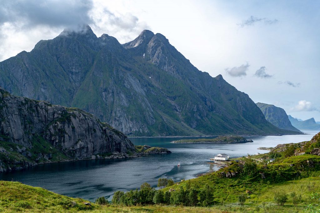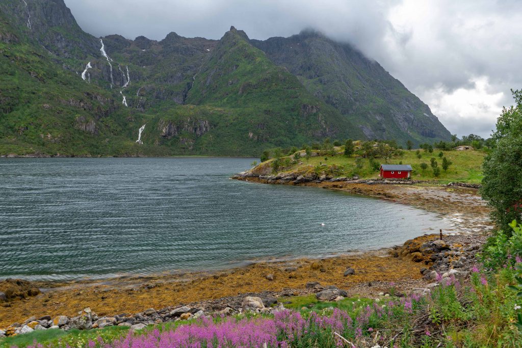 Übernacht kam der Wetterumschwung. Regen, Wind, aber immerhin 17 Grad Celsius. Die Stimmung ist gedämpft. Als der Regen am Nachmittag eine Pause macht und sich die Sonne ab und zu zeigt, entschließen wir uns den nördlichen Teil von Austvågøya, der größten und östlichsten Insel der Lofotenkette, zu umrunden. Sensationelle Ausblicke gibt es heute nicht oder werden von den Wolken verdeckt. Dennoch gelingen uns ein paar schöne Aufnahmen. Der kleine Leuchtturm von Laukvik gibt ein schönes Motiv ab. Auch die durch den Regen entstandenen Sturzbäche oder Wasserfälle an vielen Bergen sind sehenswert. Dennoch hoffen wir auf besseres Wetter, denn morgen geht es nach Reine, dem wohl schönsten Ort der Lofoten.