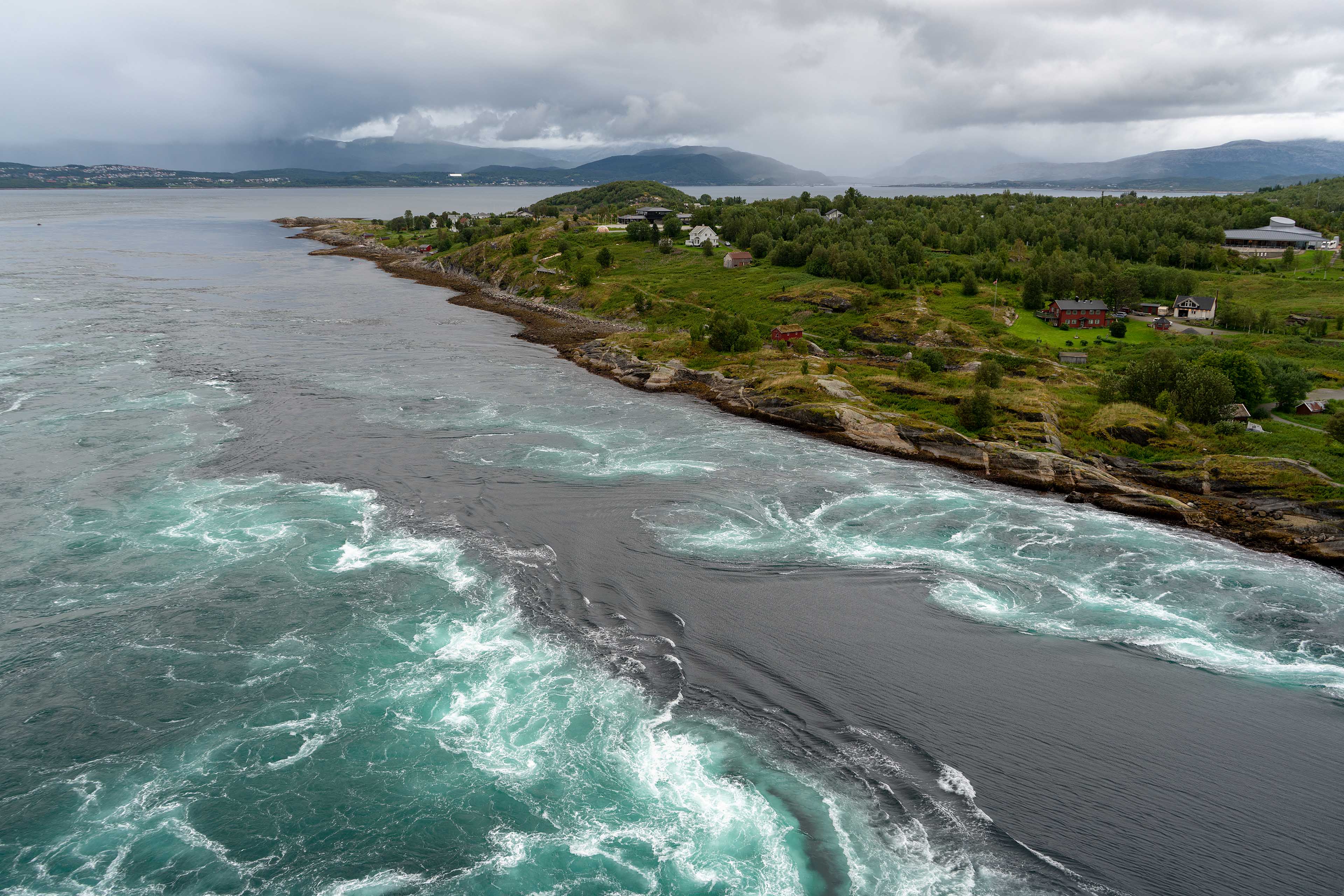 Heute verlassen wir die Lofoten. Ein letzter Blick bei Mølnarodden und es geht auf zur Fähre nach Lødingen. Nach lockeren 3 Stunden stehen wir am Kai und müssen nicht lange auf die hochmoderne Fähre warten. Eine bequeme Überfahrt von einer Stunde Dauer bringt uns nach Bognes und von dort erreichen wir am Nachmittag Bodø. Wir essen früh zu Abend, denn wir müssen unbedingt noch gegen 20 Uhr bei Saltstraumen, das etwa 30 Kilometer südlich liegt, sein. Dort befindet sich der größte Malstrom der Welt. Aus einem 80 Kilometer langen Fjord werden riesige Wassermassen in einen 2,5 Kilometer langen und rund 150 Meter breiten Sund gepresst.Das Spektakel, bei dem fast 400 Millionen Kubikmeter Wasser mit einer Geschwindigkeit von bis zu 13 Metern/Sekunde in die Meerenge hinein- und wieder herausgedrückt werden, wiederholt sich tagtäglich vier Mal. Wenn man die Ein- und Auslaufzeiten beachtet, dann weiß man, wann der Gezeitenstrom am stärksten ist. Ich muss sagen: ein echt beeindruckendes Naturereignis, das man gesehen haben sollte.