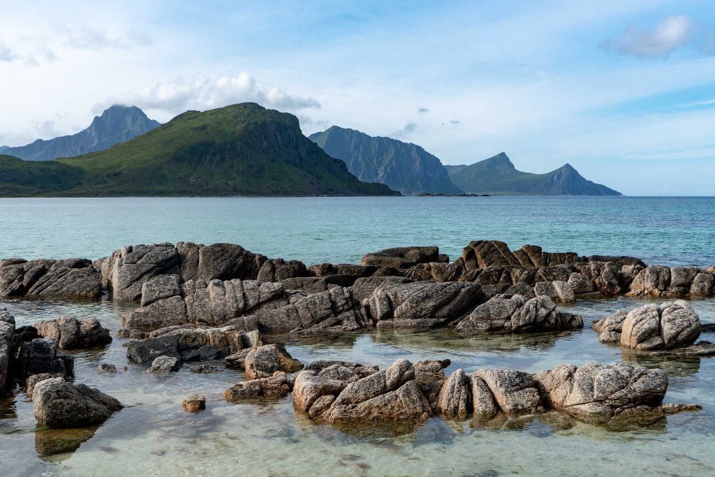 Blauer Himmel, Sonnenschein, 21 Grad Celsius und die Lofoten ergeben den perfekten Tag. Durch großartige Natur fahren wir als erstes zum Rørvikastrand bei Hennigsvær, denn der kleine, aber feine Sandstrand soll einige tolle Fotomotive bieten. Wir haben Glück, einige Camper haben ihre Zelte schon abgebaut und wir können ein paar Fotos schießen, bevor eine asiatische Gruppe den Strand in Beschlag nimmt. Ein paar Kurven weiter bietet sich wieder ein toller Blick auf das glasklare, saubere und grün schimmernde Wasser, von dessen Ufern die Berge einige Hundert Meter in den Himmel ragen. Der Ort Henningsvær liegt auf zwei kleinen, vorgelagerten Inseln, die über zwei Brücken mit dem Festland verbunden sind. Aufgrund seines urtümlichen Fischerdorf Charakters kommen viele Touristen hierher um das farbenfrohe Panorama des Ortes, zu erleben. Ein weiterer Abstecher abseits der Hauptstrasse E 10 führt uns zu einem weiteren langen, fast südseeartig anmutendem Sandstrand bei Gimsøy. Über Svolvær, der größten Stadt der Lofoten fahren wir zurück und haben im Nachmittagslicht am Austnesfjord noch einmal ein wunderbares, für die Lofoten typisches Panorama.