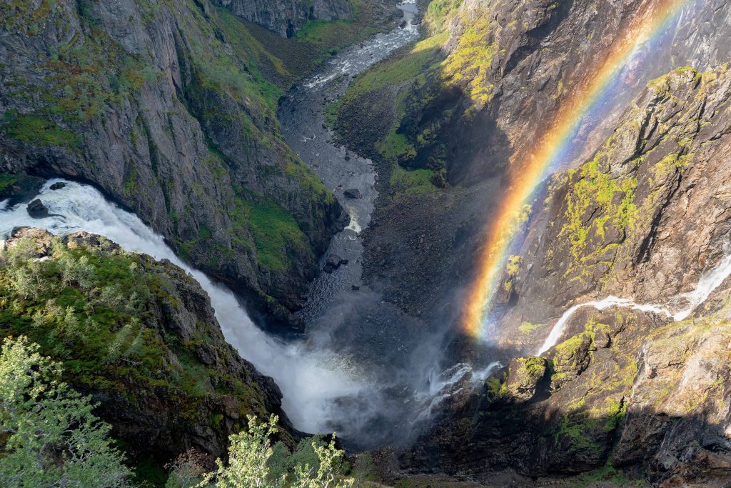 Auf unserem heutigen Tagesprogramm stehen, wie sollte es im Hardanger anders sein, zwei sehenswerte Wasserfälle. Wir brechen am Morgen auf und fahren die schmale Straße am Ostufer des Sørfjordens nach Norden. Sie führt durch kleine Ortschaften und an vielen, mit Obstbäumen bepflanzten Hängen vorbei, denn die Gegend hier ist bekannt für Obstanbau. Die Äpfel leuchten rot an den Ästen und warten nur darauf von den Bauern geerntet zu werden. An kleinen Ständen kann man in Selbstbedienung die frischen Früchte, natürlich gegen entsprechende Bezahlung, erwerben. Und welche Ausnahme: Hier muss bar bezahlt werden! Da wir kein Bargeld haben, können wir nichts kaufen. Nach einer Stunde Fahrt kommen wir nach Eidfjord. Zwei, wenn auch kleinere Kreuzfahrtschiffe liegen vor Anker, und bescheren dem ansonsten beschaulichen Ort einen Besucheransturm. Hinter dem Ort steigt die Straße zu den westlichen Ausläufern der Hardangervidda an. Serpentinen und kühne Tunnel führen uns zum altehrwürdigen Fossli Hotel mit seinen großen Aussichtsplattformen, die uns tolle Blicke auf den Vøringsfossen mit seinen 183 Metern Fallhöhe bieten. Wir haben Glück. Als wir ankommen verziehen sich die letzten Regentropfen, die Sonne kommt heraus und beschert uns ein prächtiges Licht. Wir genießen die Zeit und fahren nach zwei Stunden zurück nach Odda, um dort in der Nähe den Låtefossen zu besichtigen. Da für morgen wieder Regen angesagt ist, wollen wir den Zwillingswasserfall noch heute bei Sonnenschein sehen. Und wieder haben wir Glück, denn die Fälle liegen direkt im Licht der Abendsonne. Hier geht es eng zu, der Parkplatz ist klein und die Hauptstraße führt direkt unterhalb der Fälle über eine Brücke. Dennoch finden wir gute Spots für unsere Aufnahmen und fahren zufrieden zurück in unser Appartement.